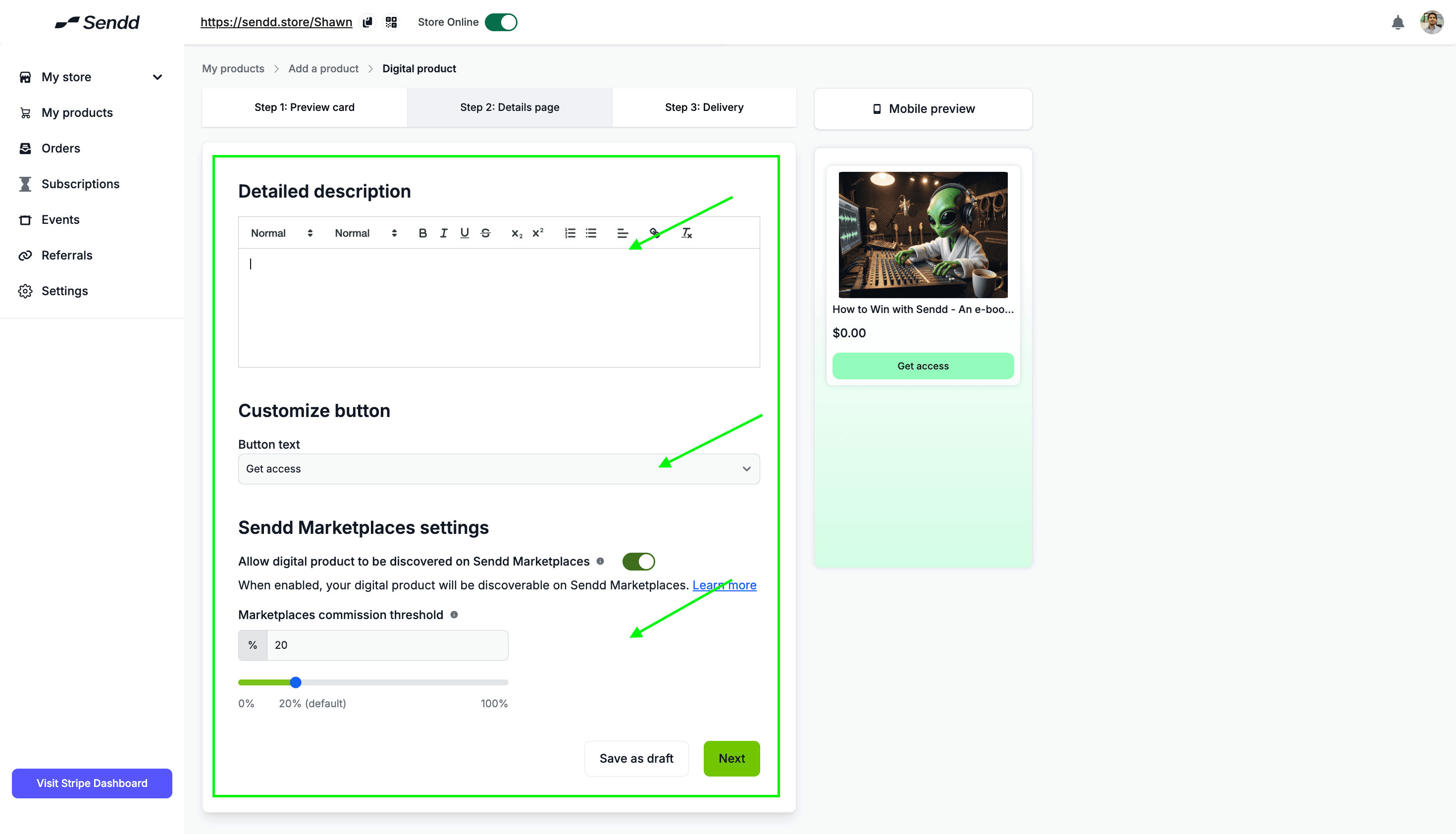 Sendd Marketplace Settings: This section is present within every kind of Product type and helps you decide on the Marketplace commission you are willing to give away by joining a Marketplace, for more information visit our Sendd Marketplace aaadocs at : https://www.sendd.store/docs/getting-started