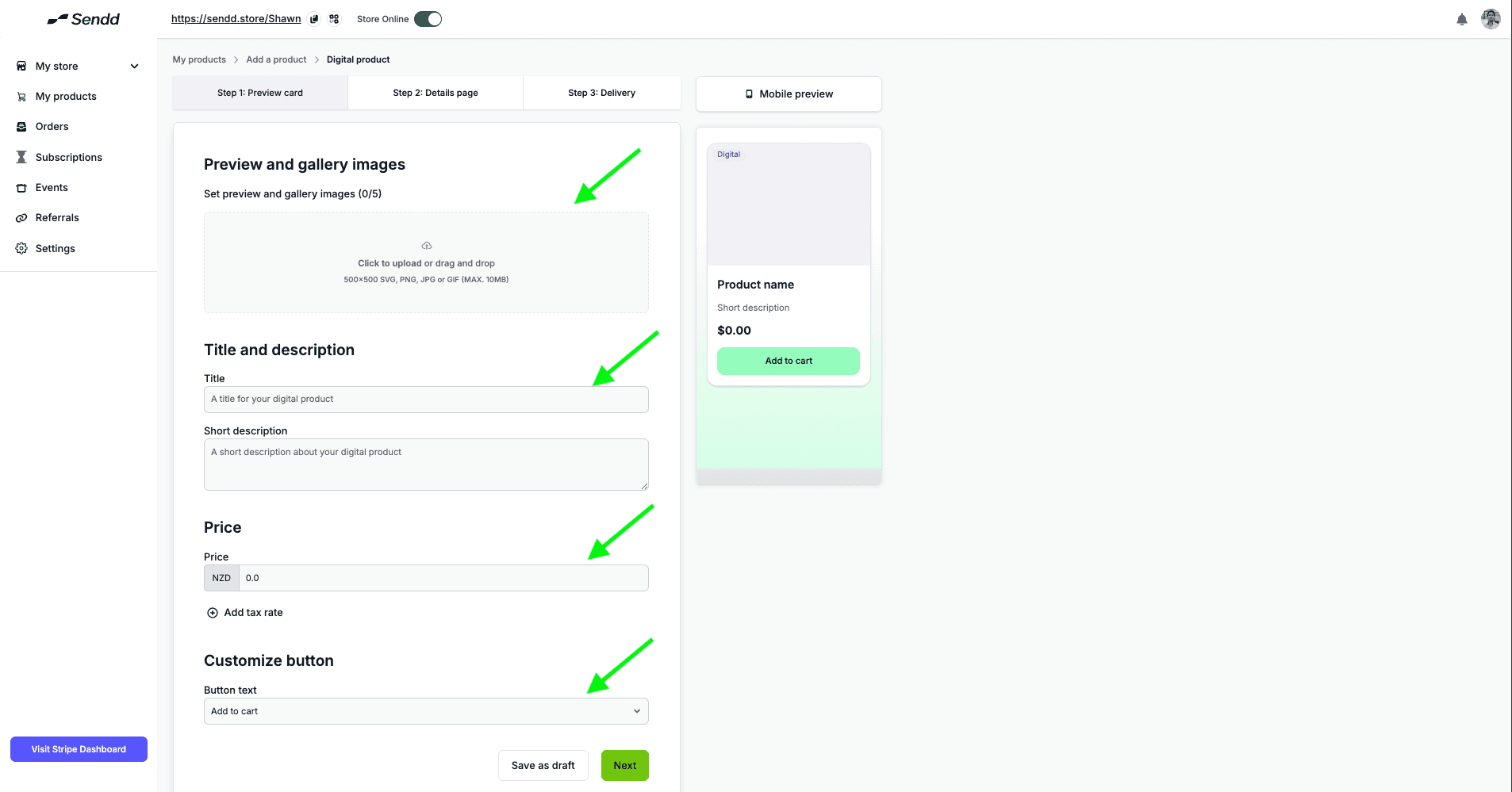 Add an Image in the Preview section to show your customers what the Digital product looks like, then Add a Title and Description - this helps your customers understand what the product you are selling is all about.