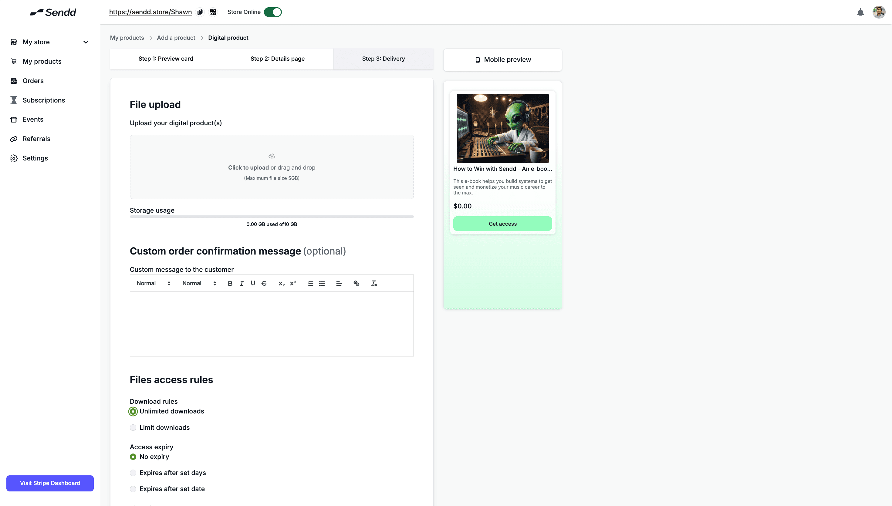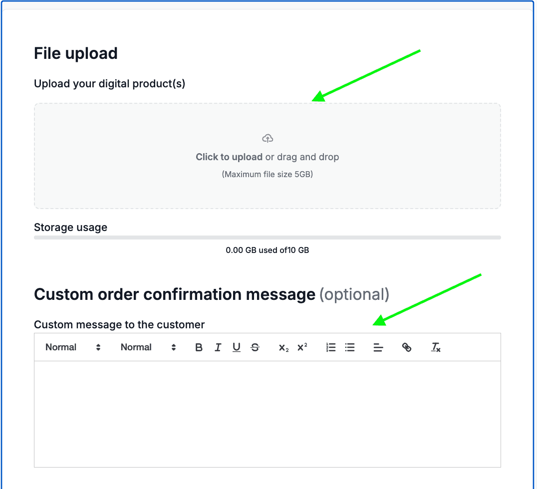 Upload your Digital Product, into the File Upload section, there is a Maximum file size of 5gb, and a total storage size for your Sendd Store at around 10 Gb.