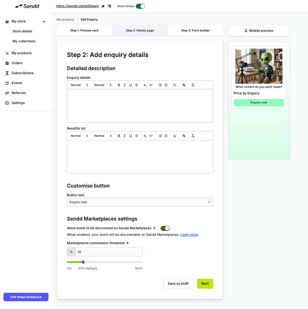 Sendd Marketplace Option: get your Enquiry form for your services visible on larger marketplaces. This Commission threshold will dictate how much marketplace commissions you are willing to give away for more visibility. Read more at : https://www.sendd.store/docs/getting-started