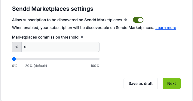 Sendd Marketplace Option: get your service/ subscription visible on larger marketplaces. This Commission threshold will dictate how much marketplace commissions you are willing to give away for more visibility. Read more at : https://www.sendd.store/docs/getting-started