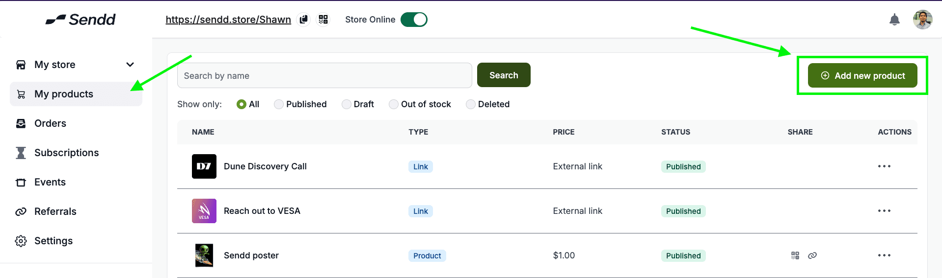 to add a subscription to your Sendd Store Click on Add New Product button within My Products: