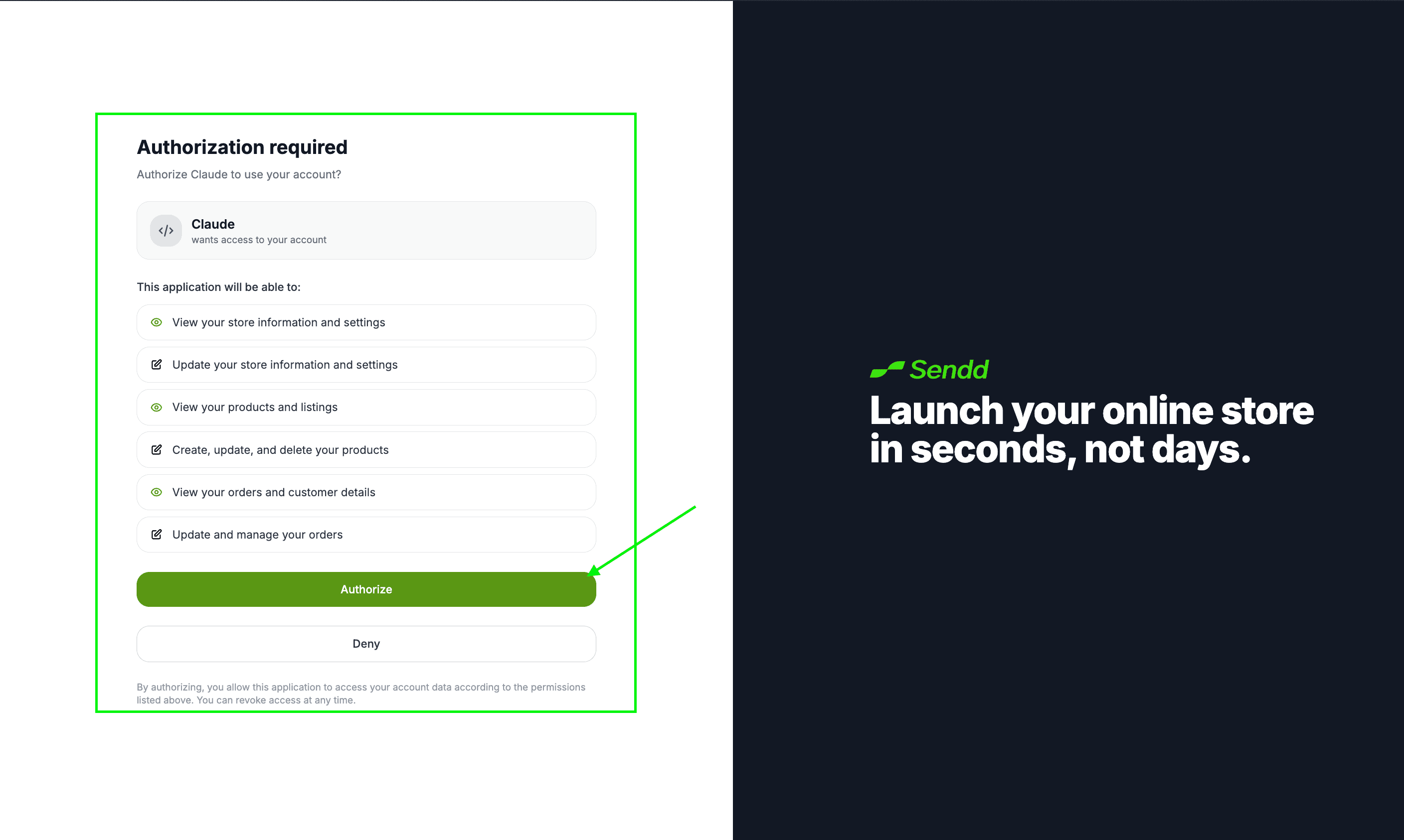 Step 7: Now once you click on Connect, you will be re-directed to a a new page within Sendd that let's Claude authorize modifications within your store.