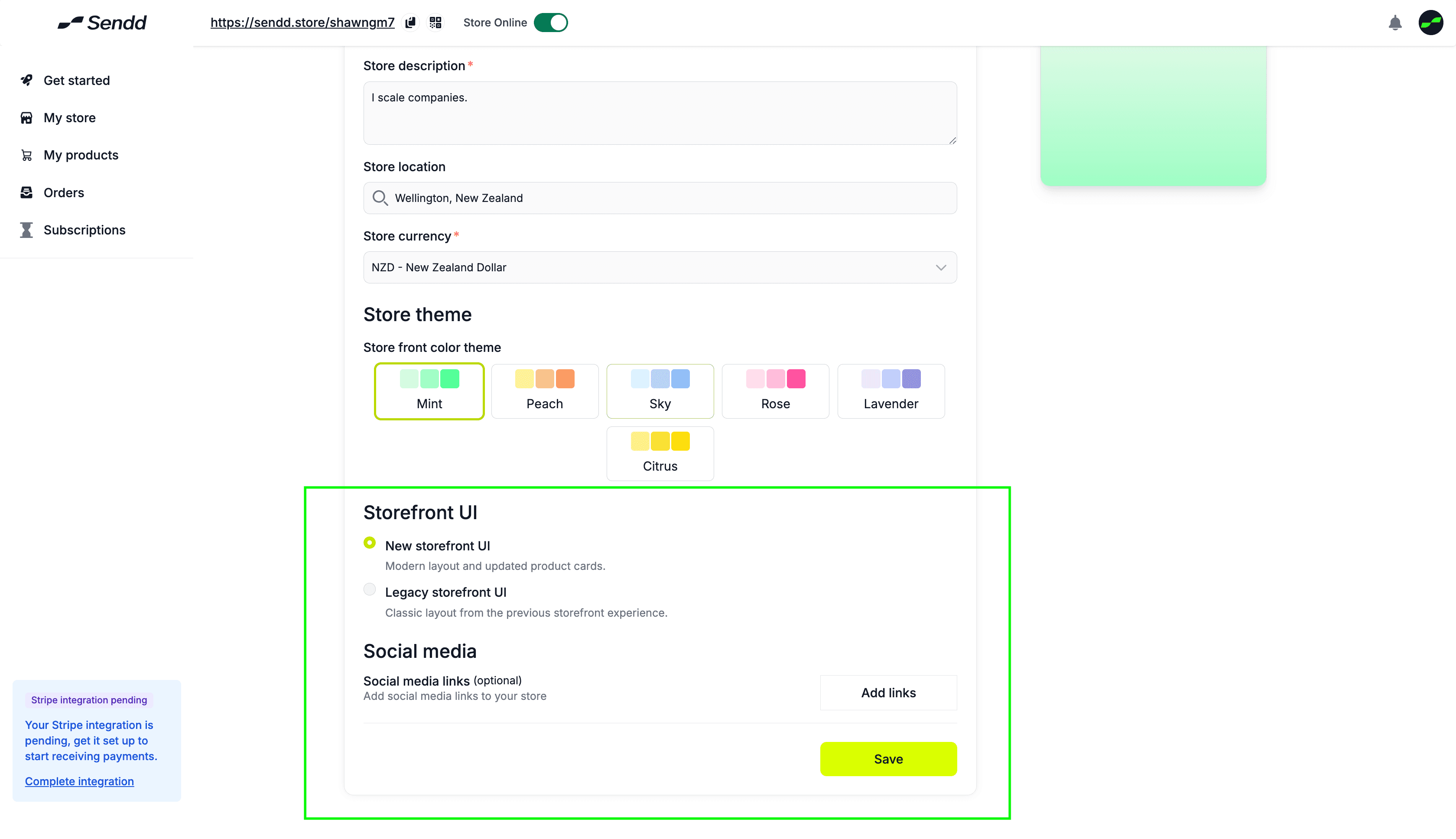 In the final section of Adding your Info, you have an option to choose between two styles of Sendd Store UI’s and also the link to adding your social media links.