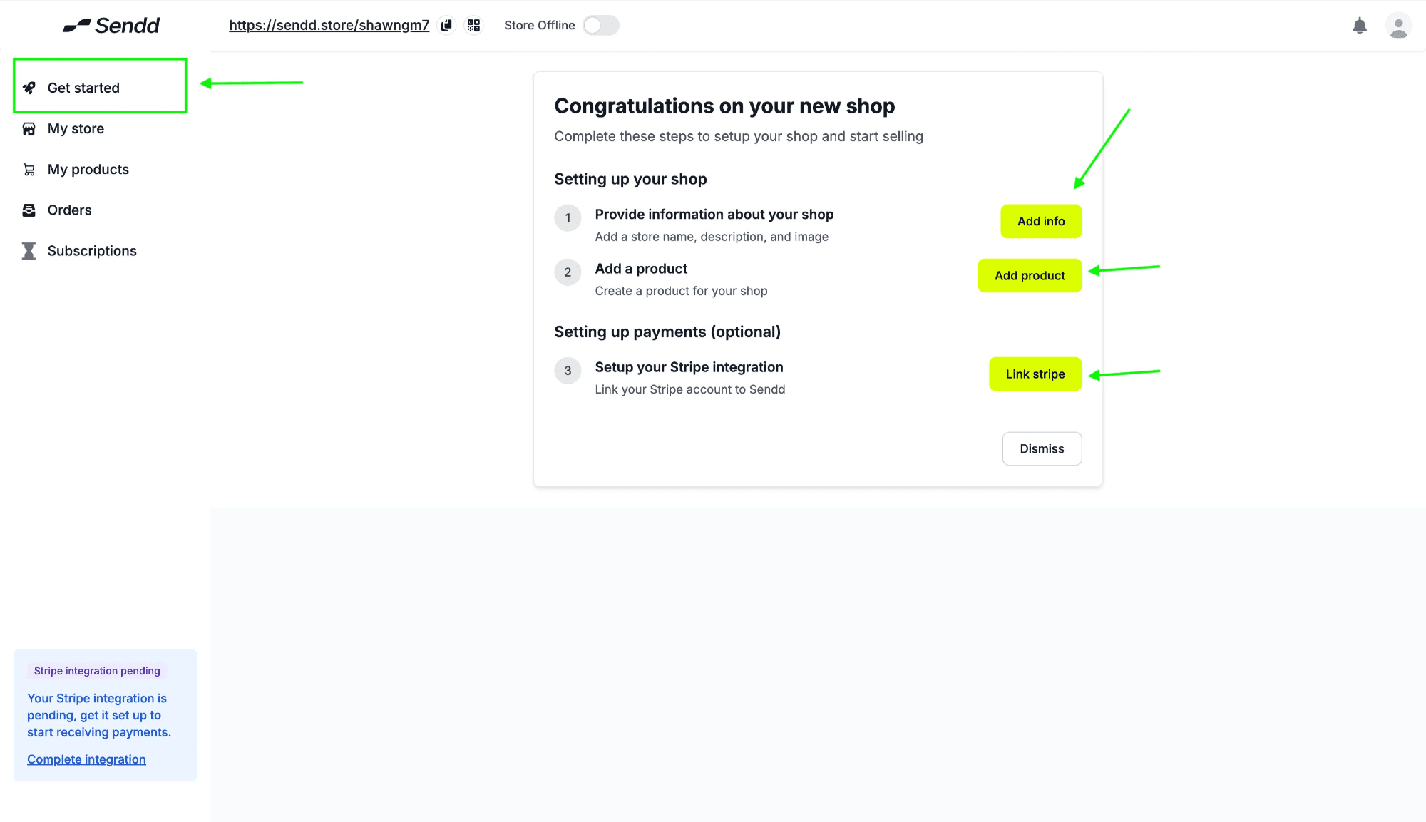 Link Stripe: Gets your setup with Stripe’s payment processor, so that you can start receiving payments through Sendd Store.
