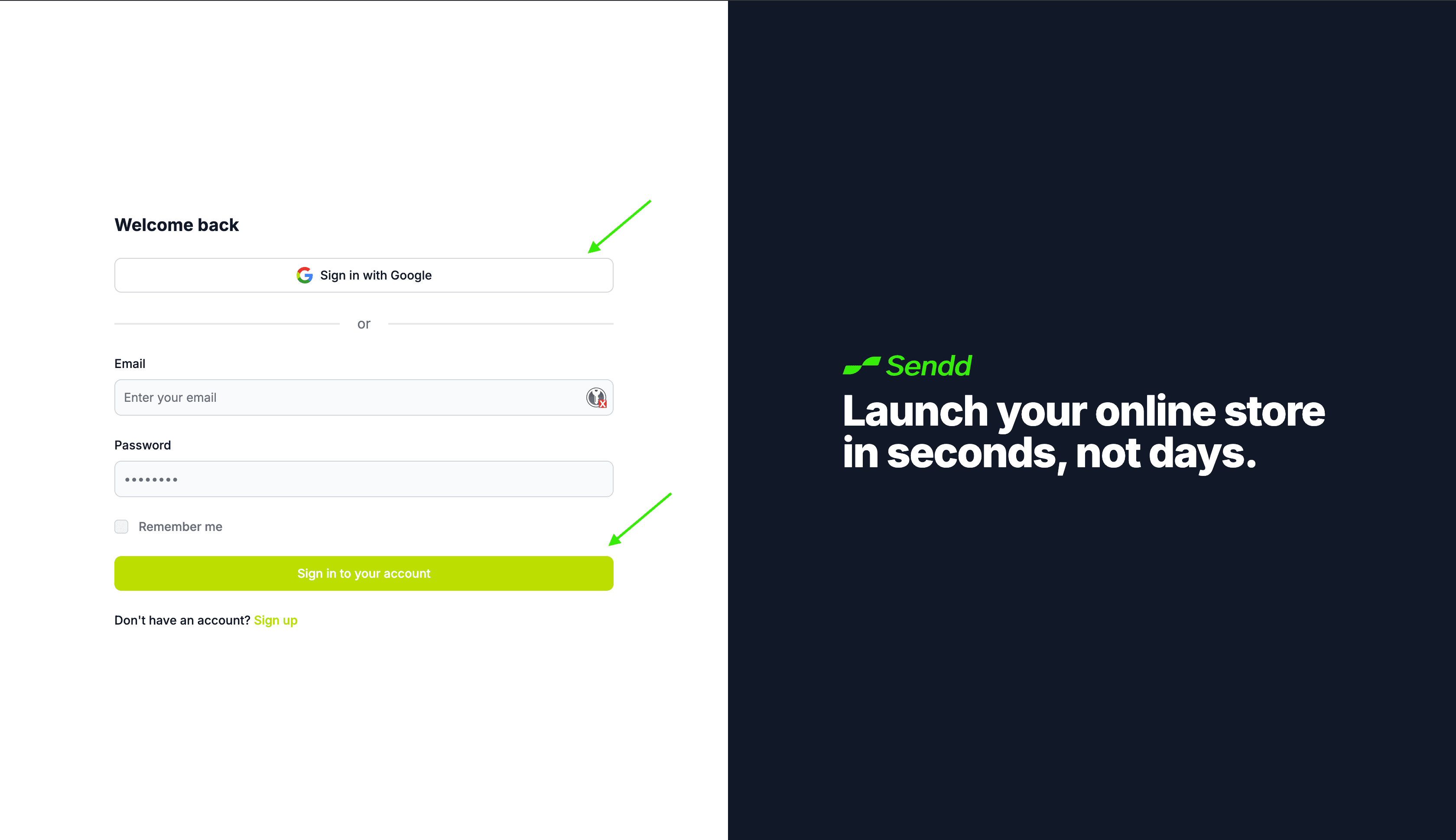 Go to https://sendd.store where you will be met with a login page. Enter your login details or easily sign in with Google.